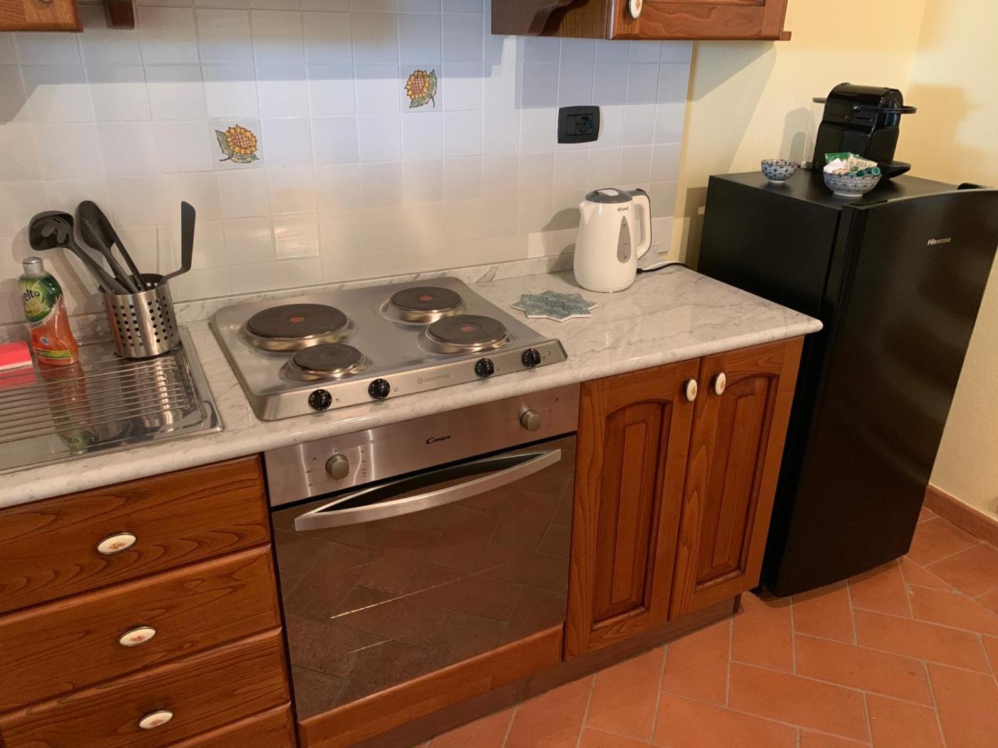 Appartamento con Vista Giardino. Appartamento con vista sul giardino, utensili da cucina e divano. Dispone inoltre di veranda esterna arredata. ;