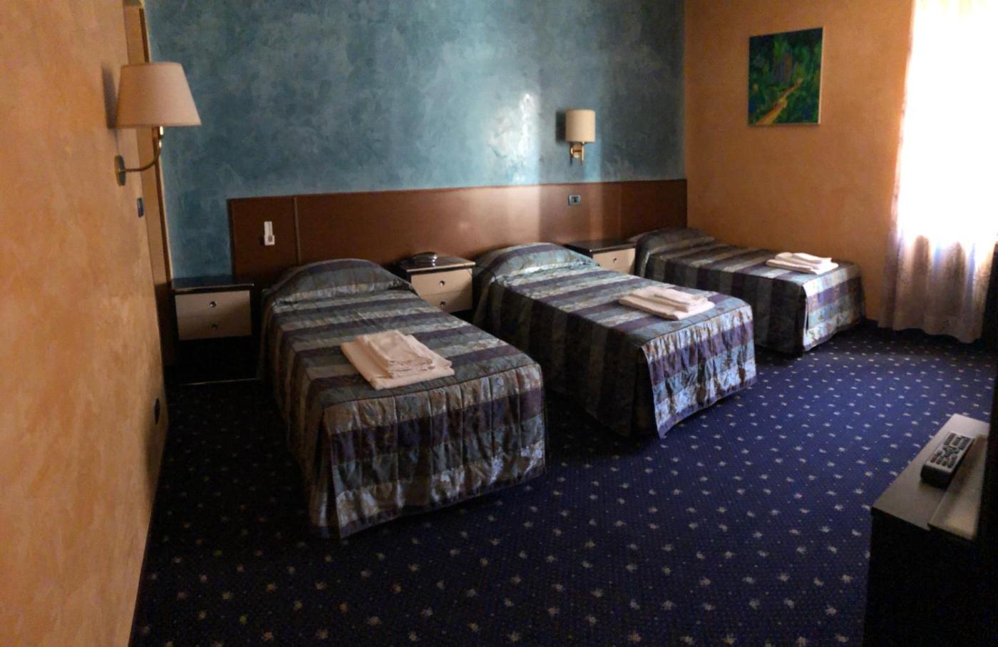 Camera Tripla. Camera tripla con bagno privato completo didi cortesia, vasca, bidet e asciugacapelli. La camera tripla è dotata di aria condizionata, minibar, armadio, riscaldamento e TV a schermo piatto con servizio streaming. ;