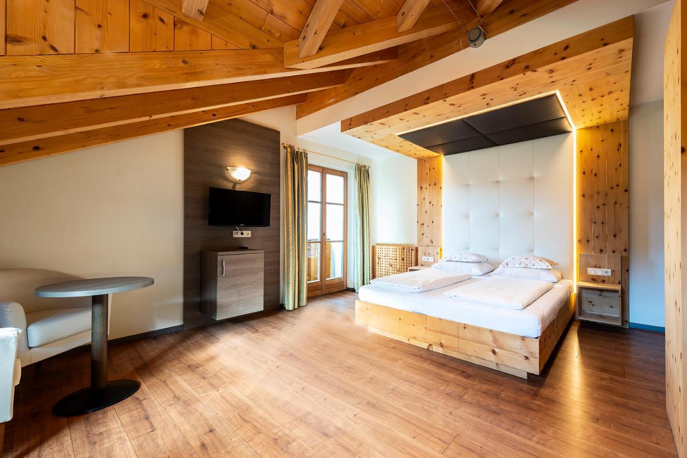 Camera Matrimoniale. Camera in stile alpino dotata di un balcone con vista sulle Dolomiti, un computer e una TV satellitare a schermo piatto. ;